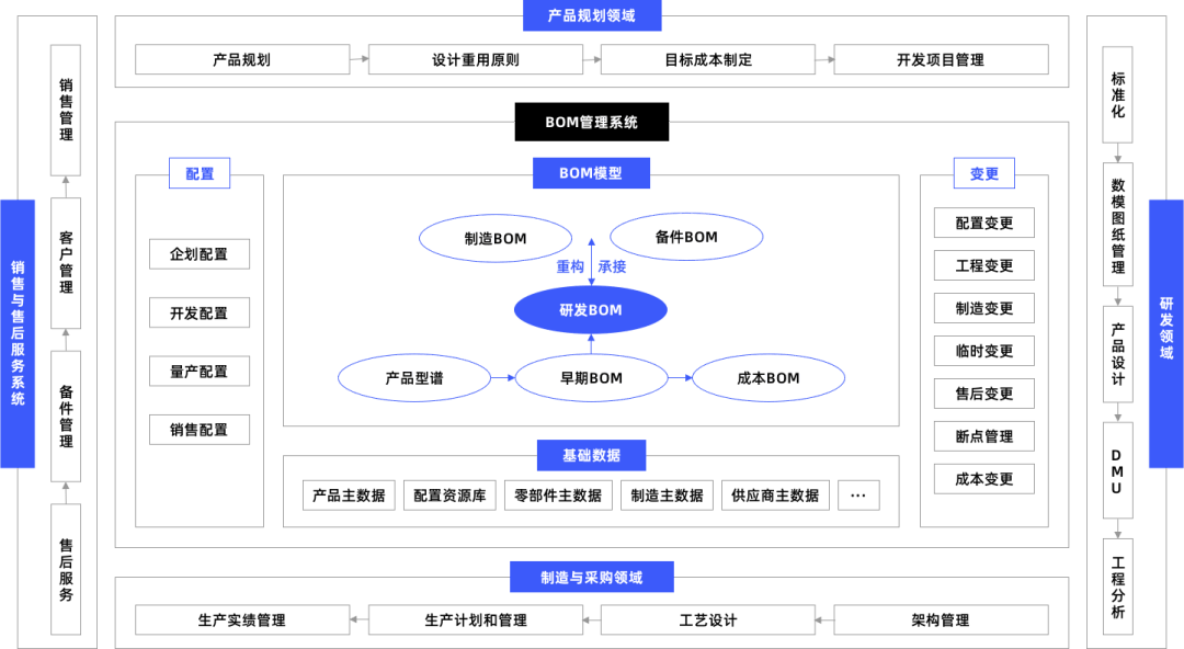 企业生产的流程有多个阶段,每个阶段有不同的需求会出现不同的问题,因此 BOM 组织体系需要覆盖各个生产流程,从早期的产品开发,到中期的产品生产制造复杂场景,再到后期产品售后维修以及业务扩展的支持,都需要建立对应的数据结构化体系,方便企业进行各流程管理。
