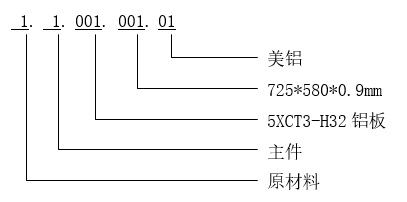 例:物料代码“01.01.001.001.01”代表“725*580*0.9mm规格  5XCT3-H32材质的  铝板”。