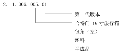 例:物料代码“02.01.006.005.01”代表“哈特门  19寸旅行箱  左边包角 (第一代版本)  坯料”。