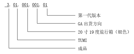 例:物料代码“03.01.001.001.01”代表“GA出货方向的  TUMI  20寸19度旅行箱(银色) (第一代版本)  成品”。