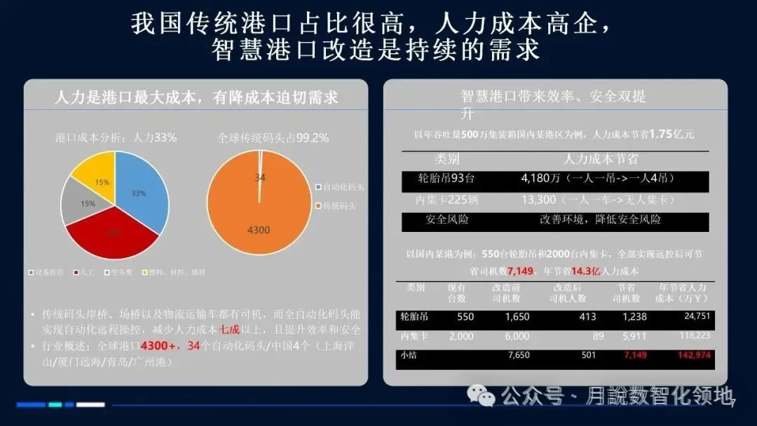 从行业痛点来看,传统港口运营模式的瓶颈日益凸显。长期以来,传统港口依赖人工操作与经验决策,存在作业效率低、人力成本高、安全风险大、资源配置不合理等问题。随着全球海运贸易量持续增长与船舶大型化趋势加剧,传统港口的吞吐能力、作业速度已难以匹配贸易发展需求,亟需通过智能化转型突破产能与效率瓶颈。同时,港口作为能源消耗与碳排放的重要场景,在全球碳中和目标下,绿色转型压力凸显,而数智化技术正是实现能源高效管理、节能减排的核心路径。