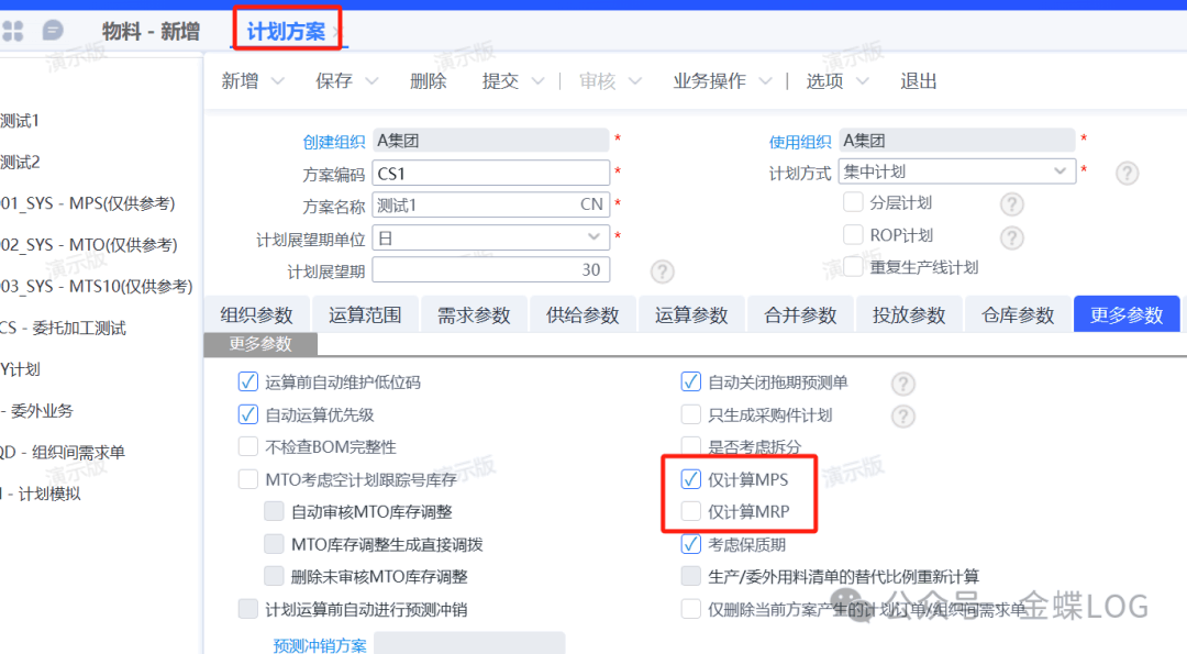 如果要限制此方案只跑MPS或MRP的物料,可以在计划方案的【更多参数】里面勾选【仅计算MPS】或【仅计算MRP】。