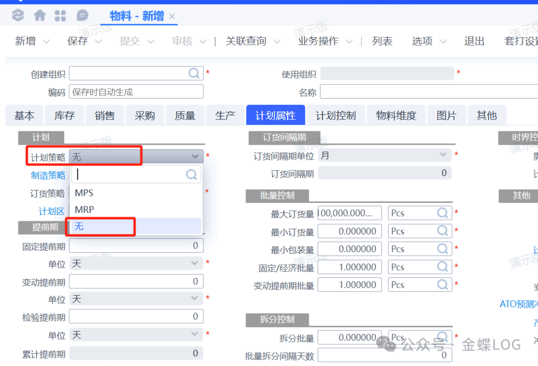 在物料信息中,计划属性页签下面有一个【计划策略】字段,它的值分别包含"MPS"、"MRP" 以及 “无” 三种;那么这三种值分别表示什么意思,以及对计划运算有什么影响?通过这篇文章来详细学习。