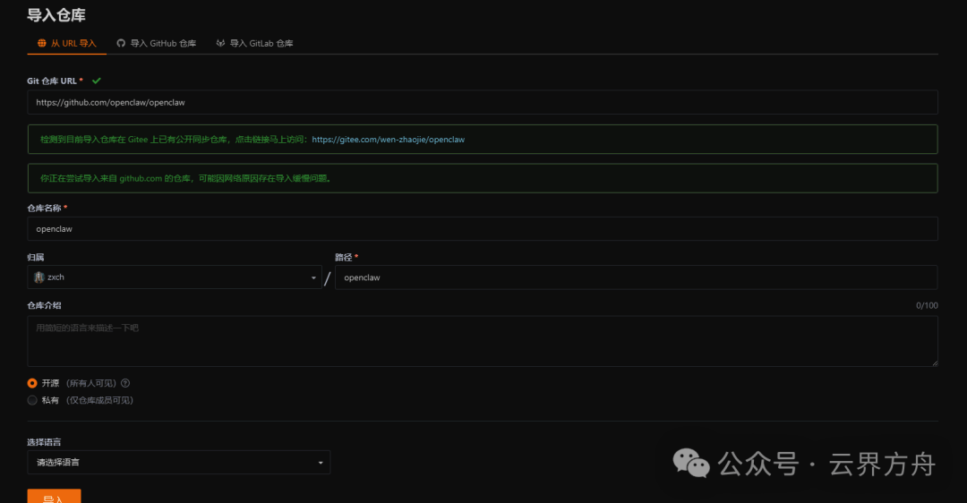 注册并登录之后,就可以把github上的项目导入到gitee上面你输入OpenClaw 的地址,会发现已经有公开仓库,你直接点击就可以访问,如果你想在你的仓库上进行管理,继续导入就行了如果你想把仓库克隆到本地,直接复制克隆地址粘贴到命令行中就可以啦!如果你想同步更新代码仓库,点击仓库上方的同步图标就行如果你懒得弄,直接使用OpenClaw,给他一个命令,帮我把这个代码仓库克隆到本地,它就会执行了,不过会消耗很多Tokens哦!自己动手我感觉更合适!