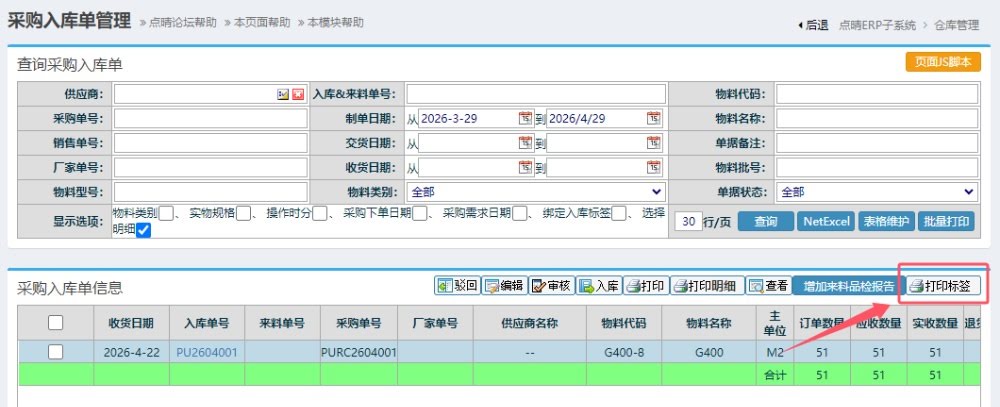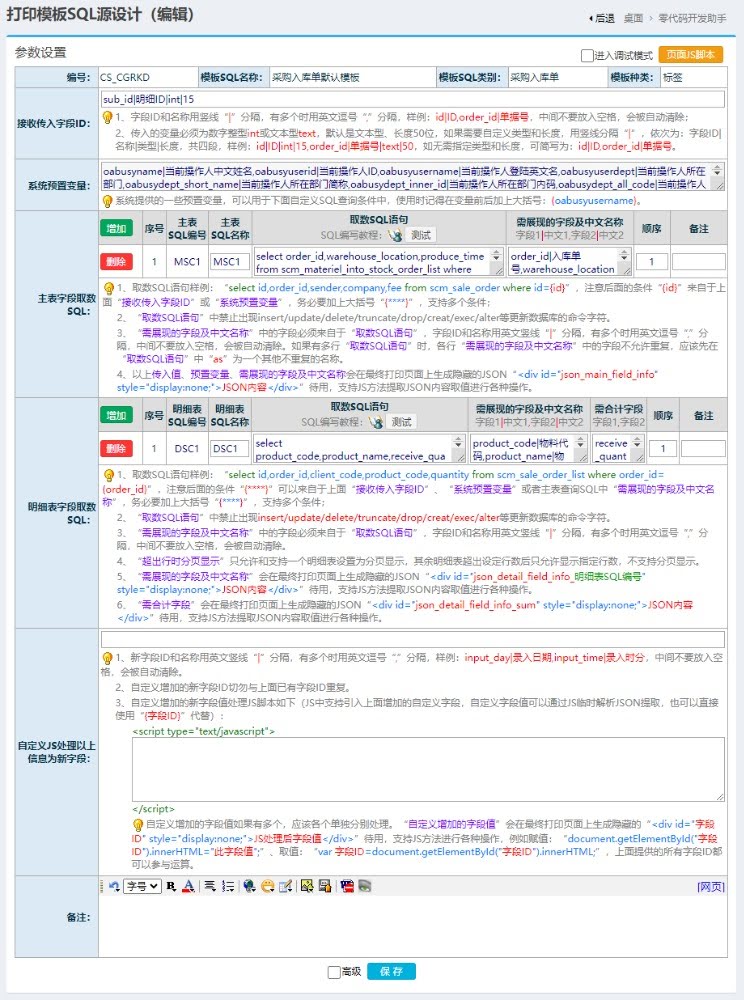 本方法需要操作者有 JavaScript 和 SQL 专业知识,下面还是以采购入库单物料标签为例进行说明。