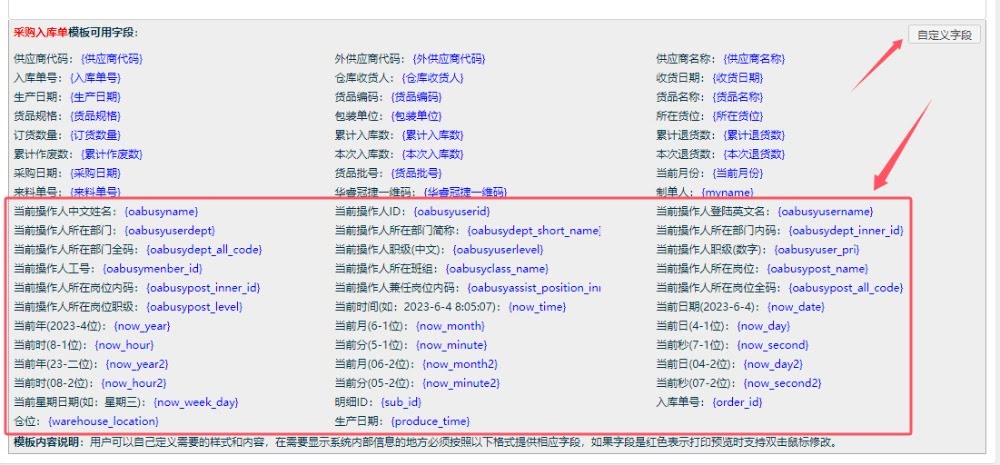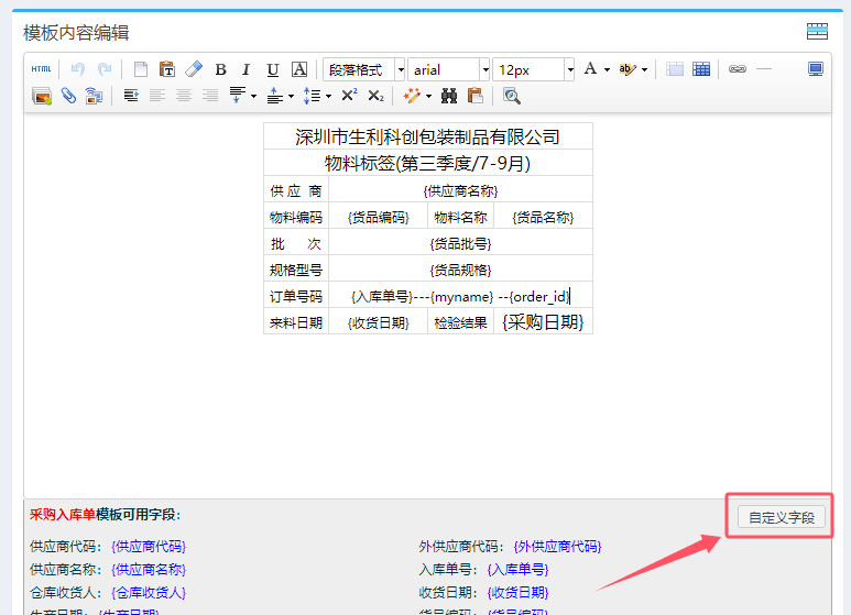 在“模板内容编辑”中,点击“自定义字段”按钮: