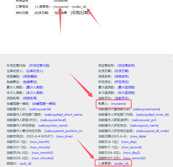 2、传入的变量必须为数字整型int或文本型text,默认是文本型、长度50位,如果需要自定义类型和长度,用竖线分隔“|”,依次为:字段ID|名称|类型|长度,共四段,样例:id|ID|int|15,order_id|单据号|text|50,如无需指定类型和长度,可简写为:id|ID,order_id|单据号。