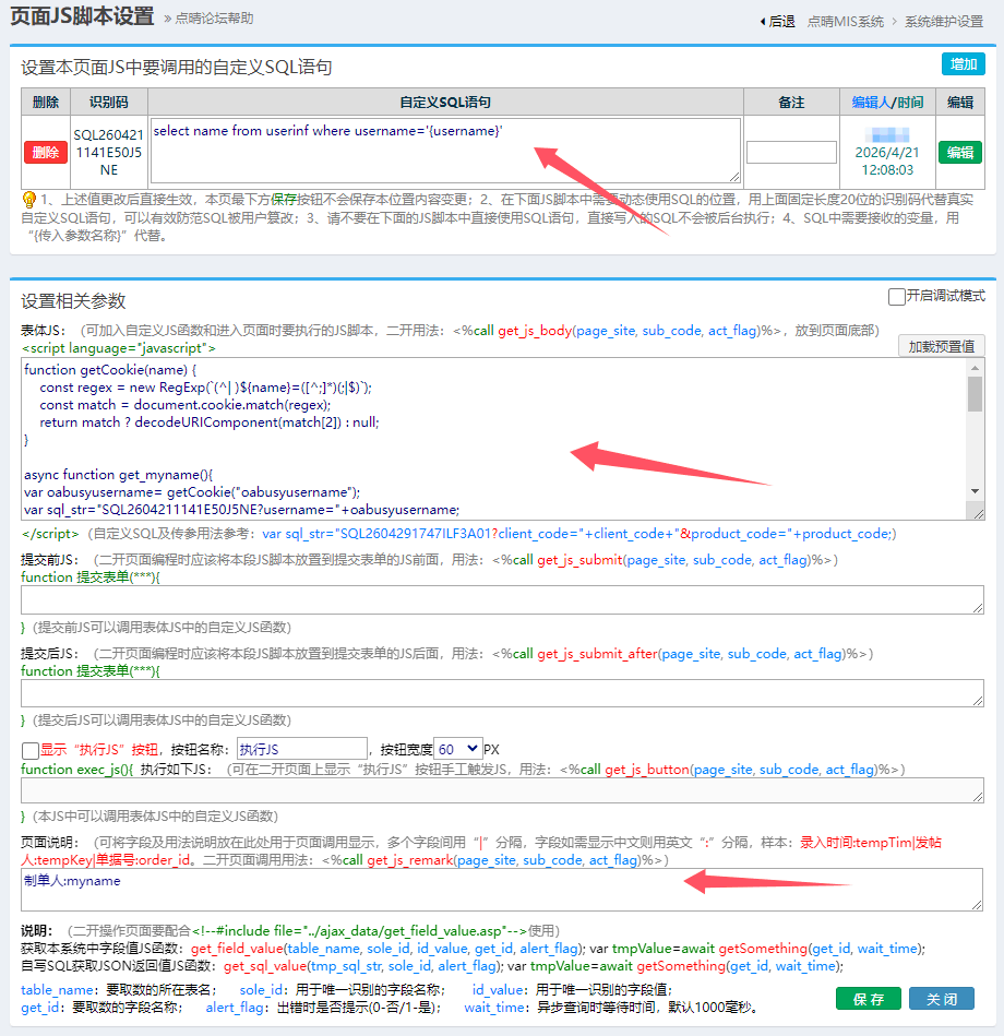 ​提交前JS、提交后JS、显示执行JS按钮,自行根据实际需求确定是否需要添加。