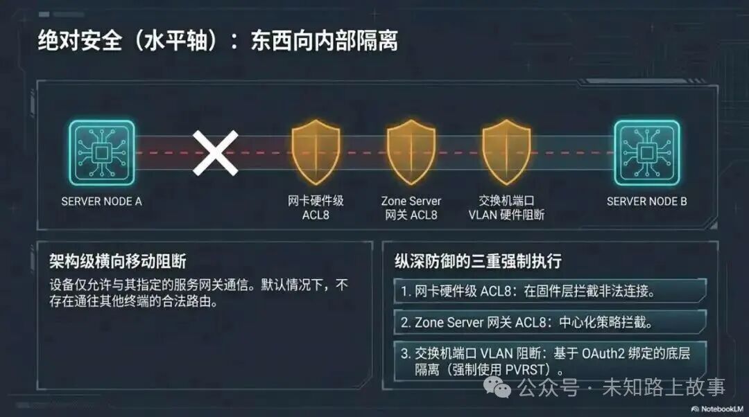 在一个局域网里,一台电脑中毒后,黑客往往会尝试攻击同一网络下的其他电脑。IPv8 的绝招:通过 ACL8 区域隔离,设备被限制只能与指定的网关通信。三重防护:它有三层防线——网卡(NIC)固件、区域服务器网关、以及交换机端口的硬件验证。