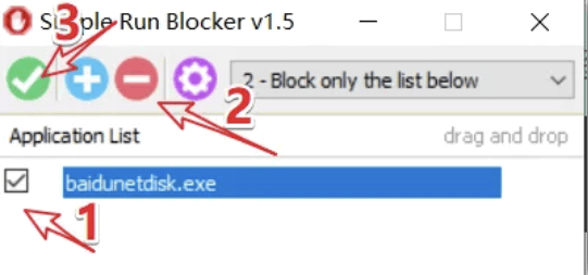 把百度网盘拖进软件里,再点击绿色的 ✅ 按钮,程序就会被禁止运行。