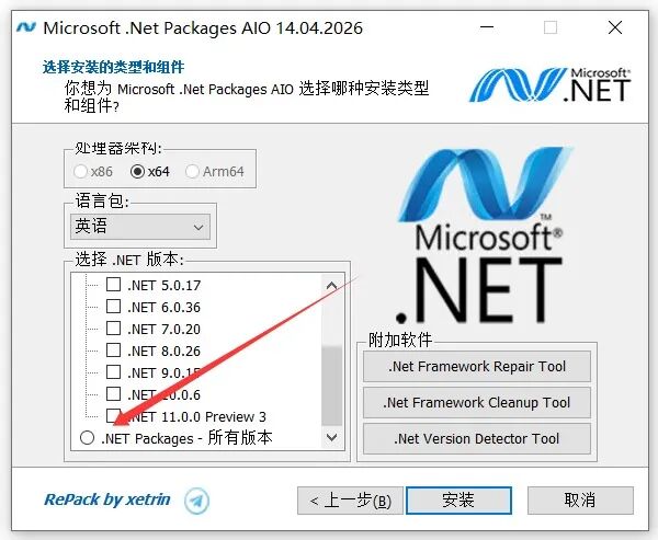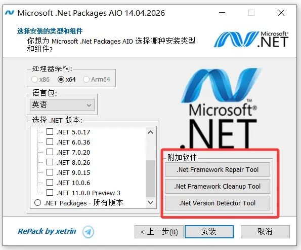 在软件右侧还附带了.Net Framework的修复工具、清理工具、以及版本检测工具,让你能轻松对电脑上所安装的.net运行库进行维护,选择好之后点击安装即可。