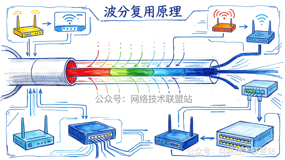 它在光纤里使用了波分复用技术。简单理解就是,一根光纤里可以跑不同颜色的光,每种颜色的光都可以代表一个独立的通道。这种技术带宽极大,而且依然保留了那种“物理隔离”的安全性。