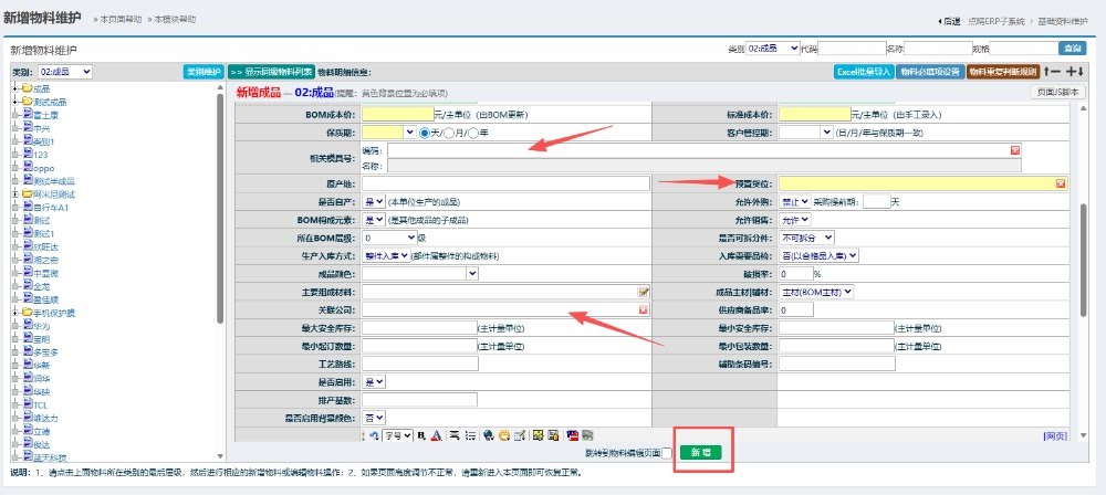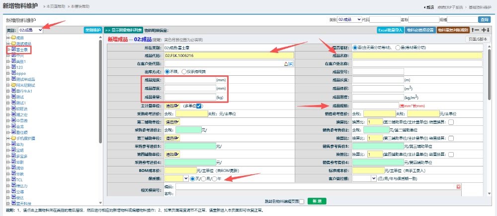 操作步骤:系统管理——物料管理——新增物料;进入页面后如下图进行操作: