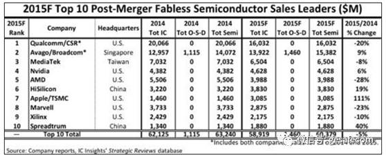 例如大家印象中很高端的芯片设计,下图是IC insight发布的2015年全球十大芯片设计公司,美国当然遥遥领先,前十名美国六家,中国2家,台湾和新加坡各一家。日本德国均未上榜。且海思和展讯营收增速排在前三位。