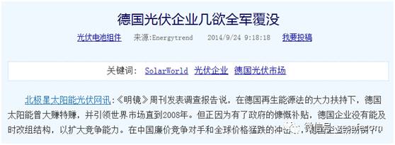 光伏产业的全球龙头是德国,一直到2008年,其全球市场份额还是世界第一,在中国企业的竞争下,德国光伏产业几乎全行业破产,博世和西门子卖掉或停止了太阳能业务。Solon、太阳能千年、Sovello、Conergy、Odersun等宣告破产。唯一幸存的大公司现在只有SolarWorld。该公司迫使债主放弃部分债务并赢得卡塔尔的大力投资,这才喘过气来。其它企业虽然还有残余或后续企业,但它们都不是独立企业。除了Solarworld外,德国太阳能工业几乎已经死亡。2013年底,德国太阳能产业只拥有4719个工作岗位。