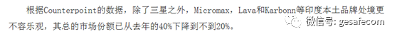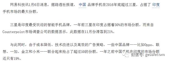 比如下面的这则新闻,在印度市场中国手机的崛起,2016年底占到了印度50%的市场份额,不只是韩国的份额被挤压,印度本土手机的份额也从40%下降到20%。