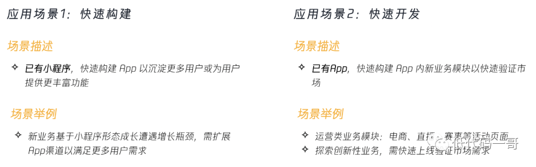 03. Donut应用场景 Donut 多端框架可以满足不同企业的业务开发需求,开发者可按照企业实际情况进行使用。主要包括两种场景: 场景1:已有小程序,快速构建App以沉淀更多用户或为用户提供更丰富功能。 场景举例:新业务基于小程序形态成长遭遇增长瓶颈,需扩展App渠道以满足更多用户需求。 场景2:已有App,快速构建App内新业务模块以快速验证市场。 场景举例:运营类业务模块,比如电商、直播、赛事等活动页面;或者用于探索创新业务,需快速上线验证市场需求。