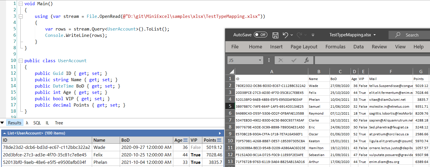5.    public class UserAccount    {    public Guid ID { get; set; }    public string Name { get; set; }    public DateTime BoD { get; set; }    public int Age { get; set; }    public bool VIP { get; set; }    public decimal Points { get; set; }    }    var rows = MiniExcel.Query\<UserAccount\>(path);