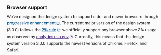 • 一旦 Firefox 在政府访问统计中的占比跌破 2% 的门槛,The U.S. Web Design System (USWDS) 会通知政府网页开发者,告诉他们不再需要支持 Firefox 了;