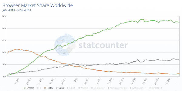 Chrome vs. Firefox vs. Safari ,从 2009 年 1 月到 2023 年 11 月