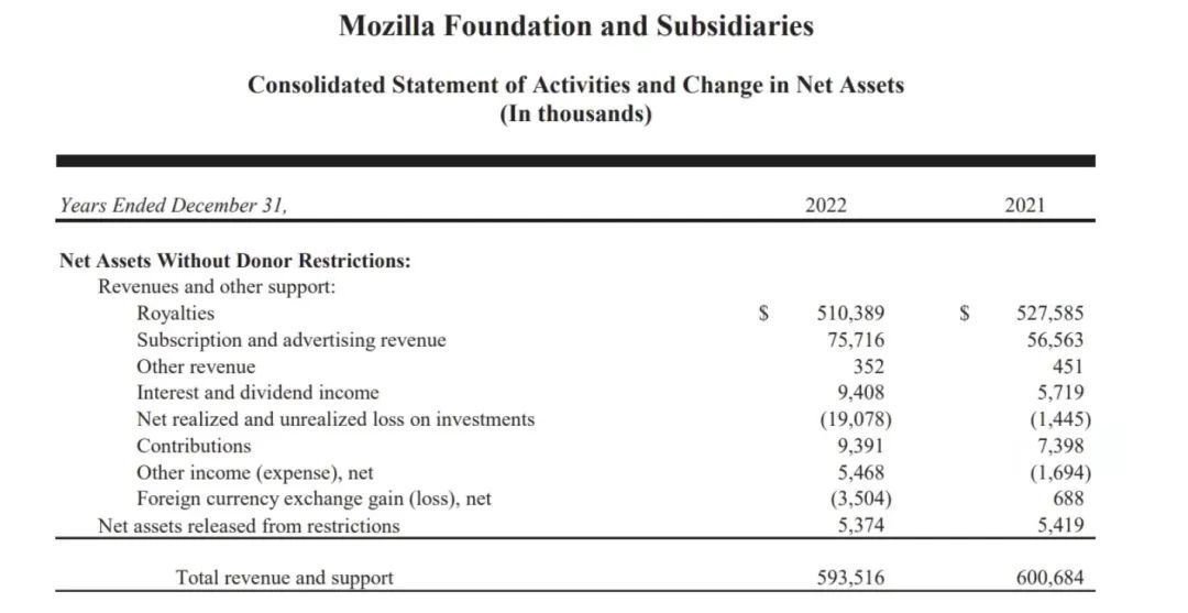 与此同时,Firefox 背后的开发商 Mozilla 在本周也公布了 2022 年的财务审计报表。Mozilla 2022 年的总收入为 5.93 亿美元,比 2021 年少 600 万美元。