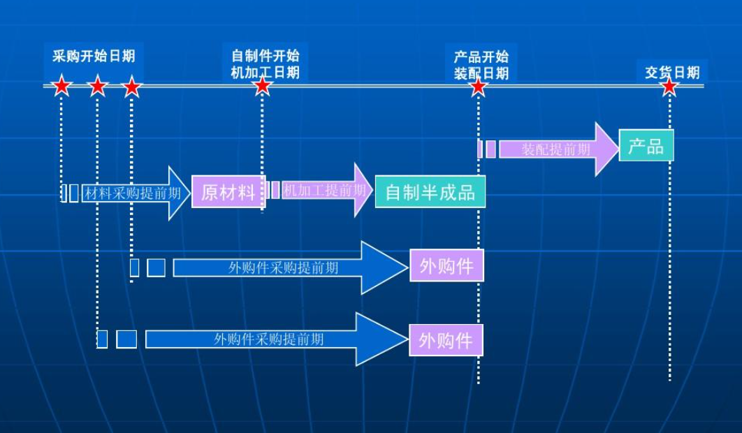 6、累计提前期:采购物料经加工到装配一直到最终检验入库的全部时间;