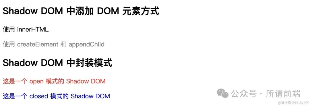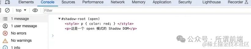 • open 模式允许外部访问 Shadow DOM 的 API,这意味着你可以从外部查询和修改 Shadow DOM 内部的元素和样式。