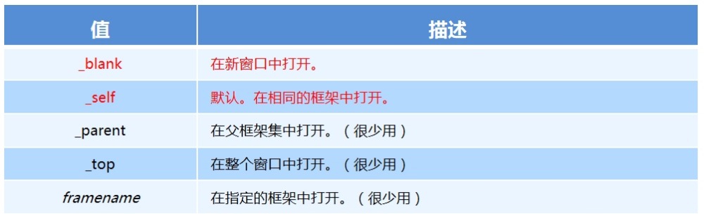 它的可选值有5个,默认情况下,target 的值是 _self,表示在相同的框架中打开 action URL。