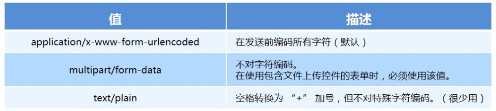 它的可选值有三个,默认情况下,enctype 的值为 application/x-www-form-urlencoded,表示在发送前编码所有的字符。