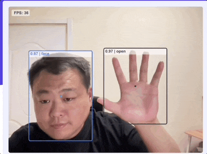 根据示例 DEMO 我们可以发现,利用 HandtrackJS 可以直接捕获到人像与手势,同时还可以根据不同的手势进行识别,如下图所示: