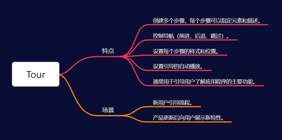 Tour 是一个引导用户通过应用程序或网站的功能点的向导。它通常用于新用户引导、功能演示或突出新功能。
