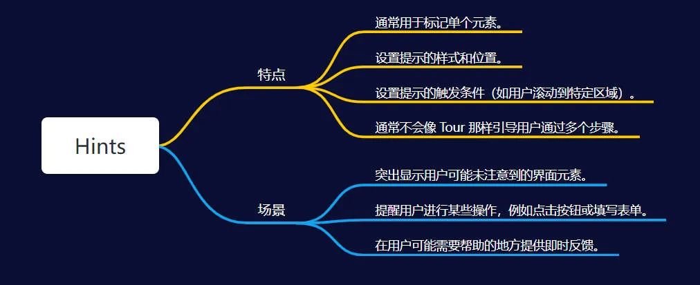 Tour 更适合于全面的用户引导,通过一系列的步骤来展示应用程序的不同部分。Hints 更适合于提供快速的提示和反馈,通常用于标记特定的界面元素。根据需求选择使用。