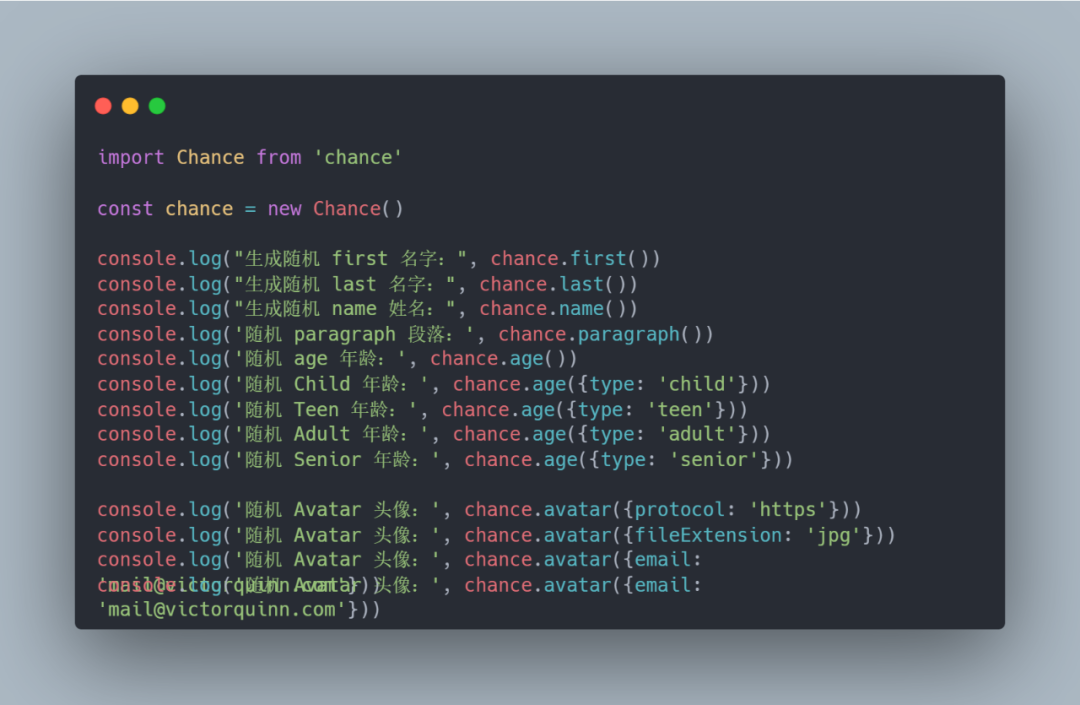 使用 Chance.js 也比较方便,创建 Chance 对象即可。