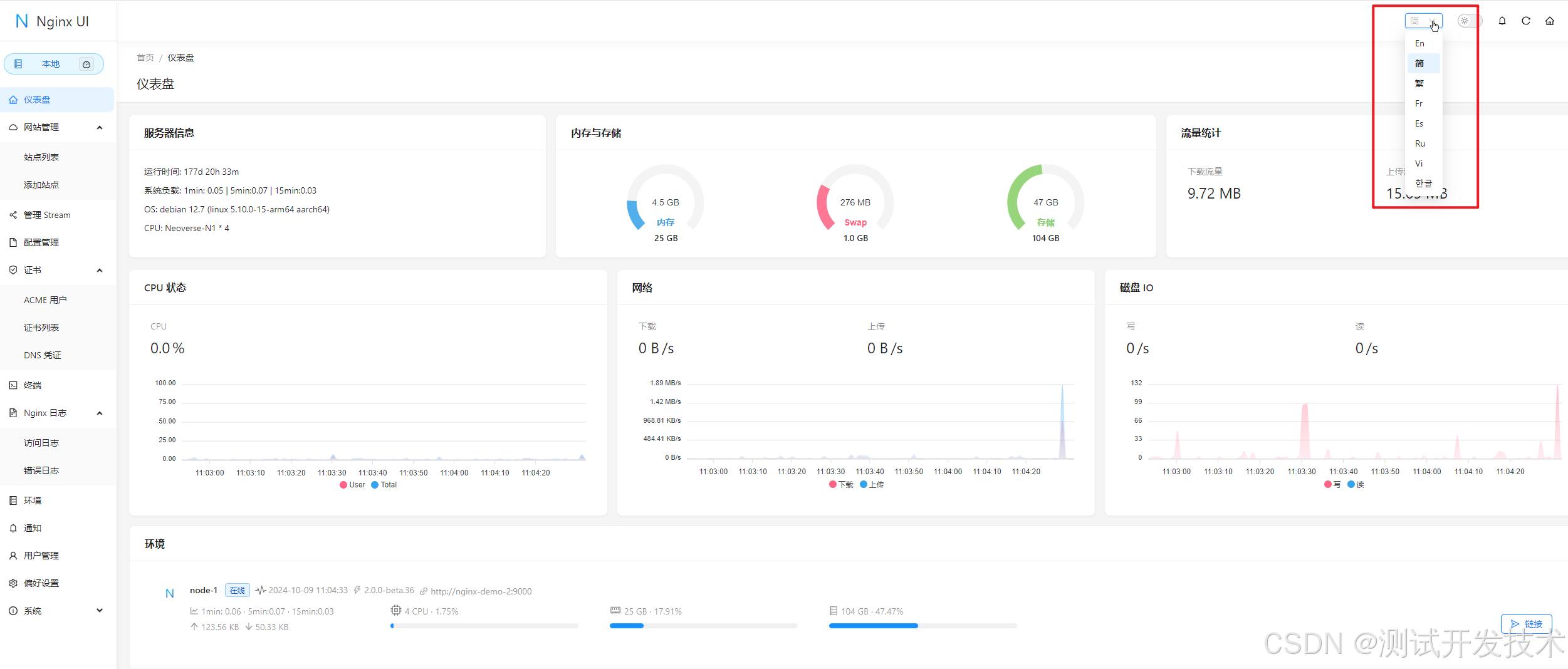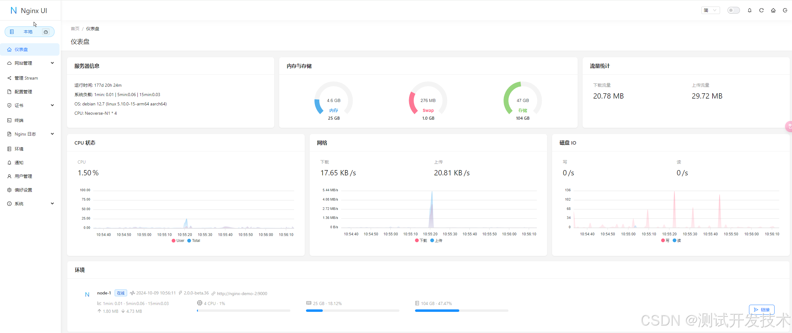 1、仪表盘是 Nginx UI 的核心功能之一,用户可以通过图形化界面监控系统的各项运行指标,包括但不限于 CPU、内存使用情况、系统负载和磁盘使用率。