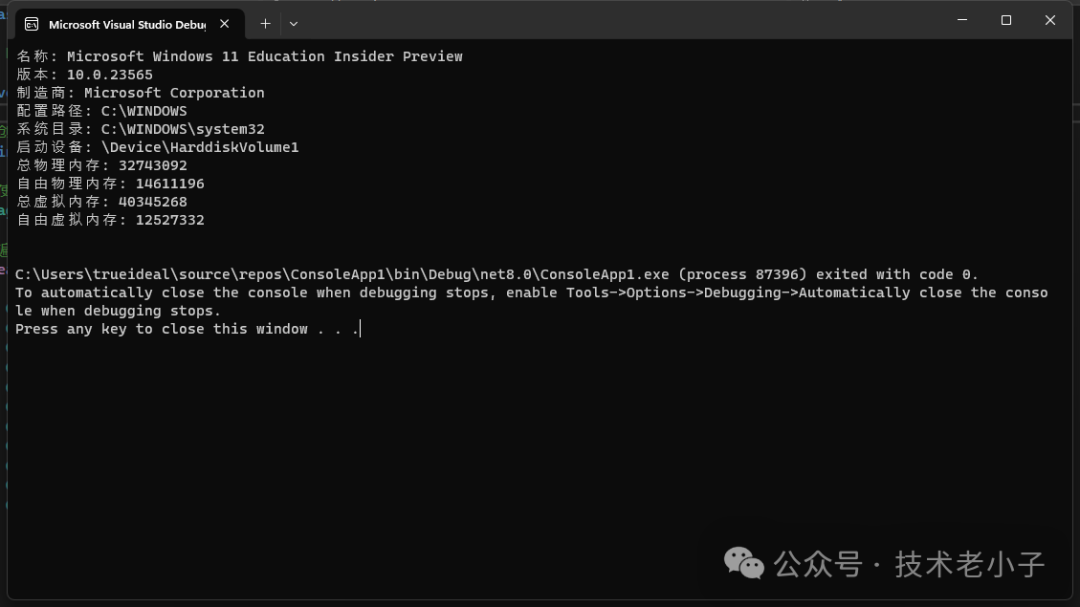 // 遍历查询结果 foreach (ManagementObject os in searcher.Get()) { Console.WriteLine($"名称: {os["Caption"]}"); Console.WriteLine($"版本: {os["Version"]}"); Console.WriteLine($"制造商: {os["Manufacturer"]}"); Console.WriteLine($"配置路径: {os["WindowsDirectory"]}"); Console.WriteLine($"系统目录: {os["SystemDirectory"]}"); Console.WriteLine($"启动设备: {os["BootDevice"]}"); Console.WriteLine($"总物理内存: {os["TotalVisibleMemorySize"]}"); Console.WriteLine($"自由物理内存: {os["FreePhysicalMemory"]}"); Console.WriteLine($"总虚拟内存: {os["TotalVirtualMemorySize"]}"); Console.WriteLine($"自由虚拟内存: {os["FreeVirtualMemory"]}"); Console.WriteLine(); }}