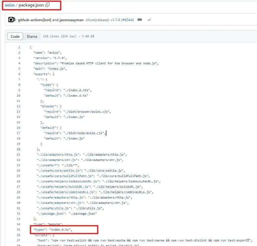 有很多第三方库提供了声明文件,可以在packages.json文件中查看。types表示类型声明文件是哪一个。