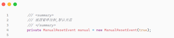 多线程的暂停继续,.NET为我们提供了另外一个对象——ManualResetEvent,这个对象会有一个值,这个值是布尔类型,就像一个门闸一样,True是打开门闸,False是关闭门闸,所以想要暂停多线程就调用这个对象的Reset方法,想要继续多线程就调用这个对象的Set方法,使用非常简单。首先我们创建一下这个对象,可以通过构造方法,给这个对象赋初始值,我这里为True,这样就能直接运行,不会阻塞,代码如下: