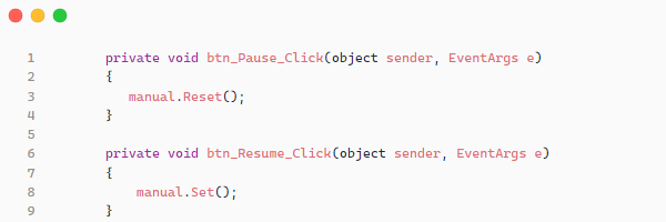 对比一下,其实就是加了一个manual.WaitOne()。线程暂停继续代码如下: