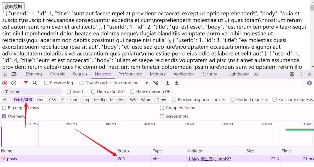 点击网络中的XHR请求,发现可以抓包到我们发送的Ajax请求,XHR代表的就是异步请求。