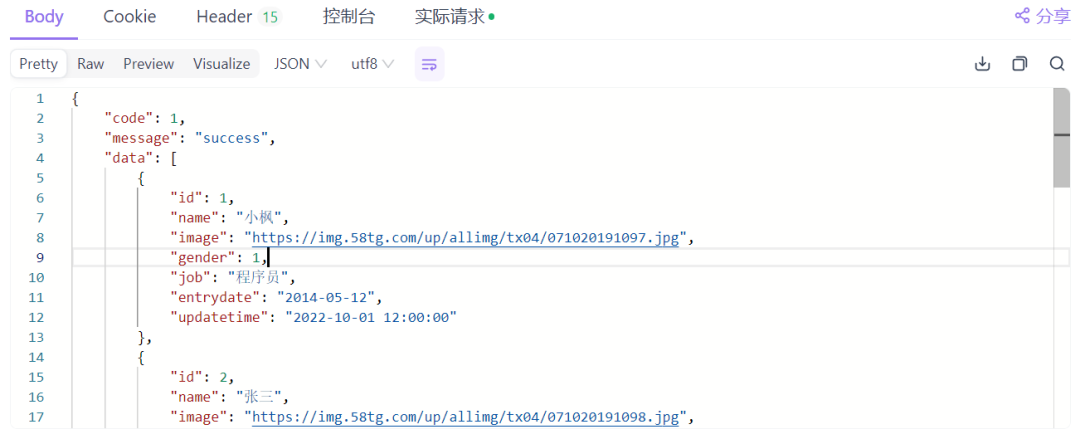 其中数据是来自于后台程序的,地址是:https://apifoxmock.com/m1/4950168-4607885-default/emp/list