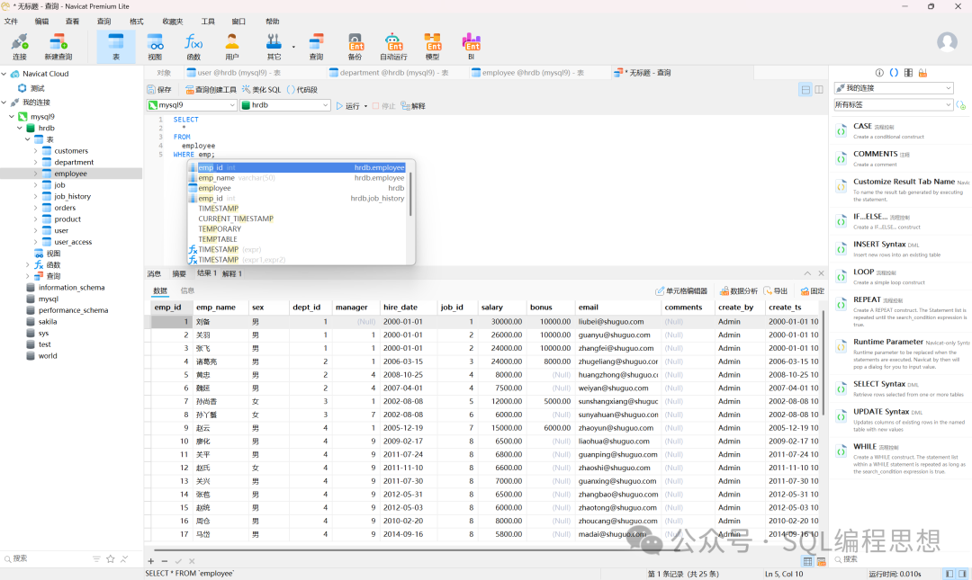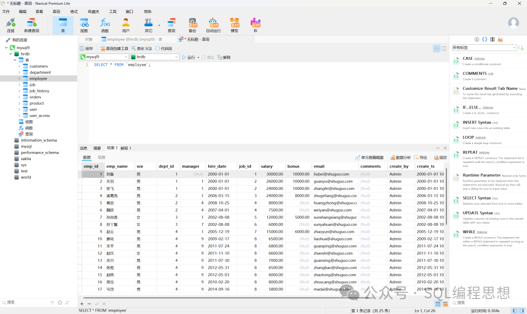 Navicat Premium Lite 内置了功能强大的 SQL 编辑器,提供语法高亮、代码补全、代码片段、执行计划、格式化等功能,可以方便地编写、编辑、执行 SQL 查询和脚本,并清晰地查看执行结果和消息。