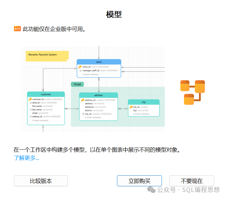 相对于 Navicat Premium 企业版而言,精简版限制了不少功能,例如数据生成、数据分析、数据同步、ERD、AI 助手、BI 等,这些功能菜单包含了“Ent”标识。