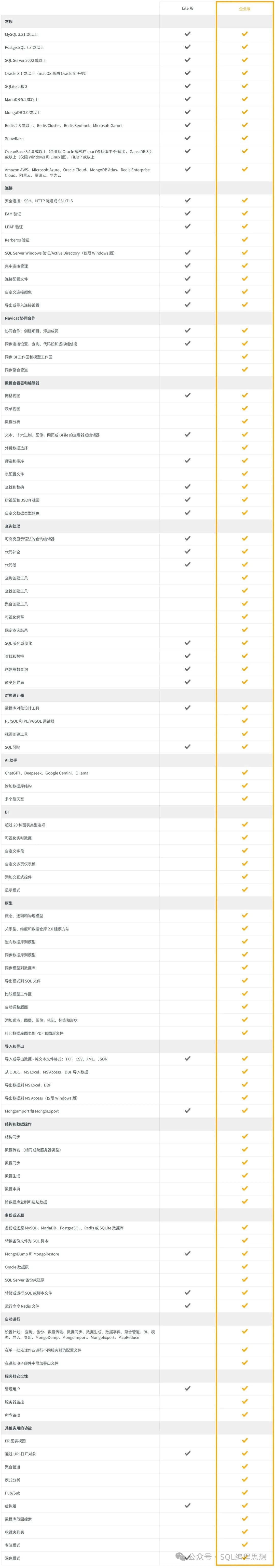 Navicat Premium Lite 版本和企业版的完整功能差异如下: