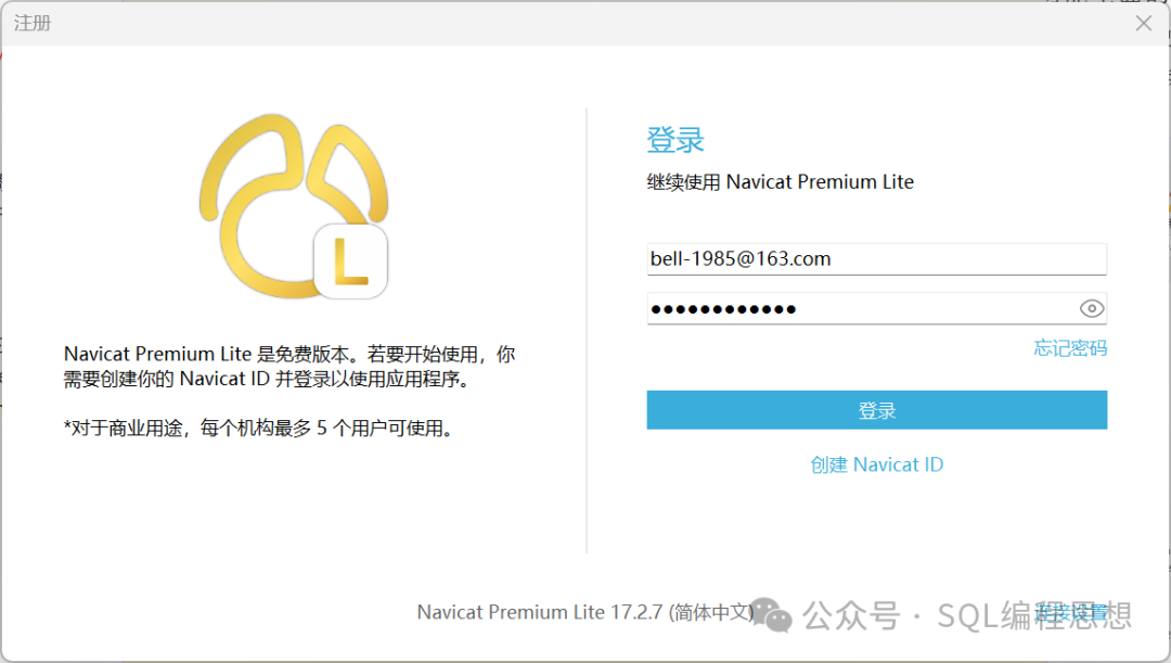 首次运行需要注册一个免费的 Navicat ID,然后进行登录: