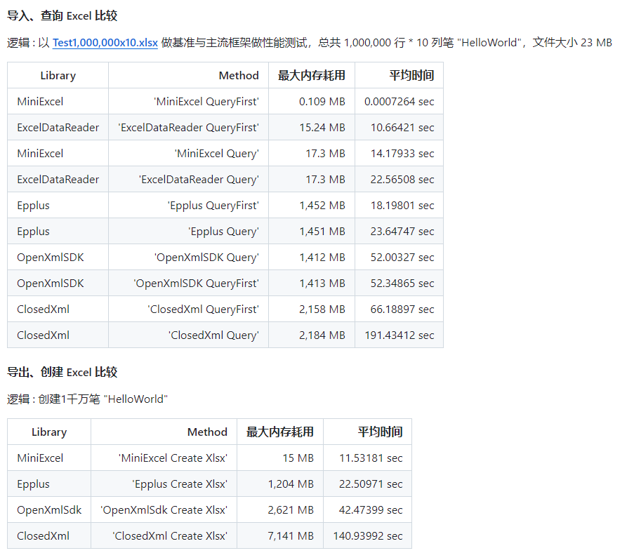 MiniExcel 是一个简单高效的 .NET 处理 Excel 查、写、填充数据的实用工具类库,旨在避免内存溢出(OOM)问题。目前主流框架大多需要将数据全载入到内存方便操作,但这会导致内存消耗问题,MiniExcel 尝试以 Stream 角度写底层算法逻辑,能让原本1000多MB占用降低到几MB,避免内存不够情况。