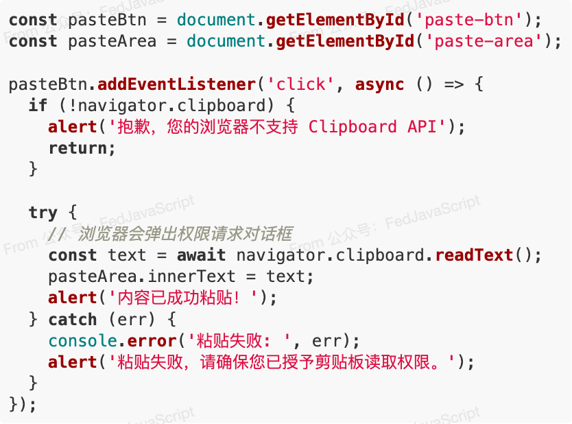 - 安全可靠:它整合了浏览器的权限系统(Permissions API)。在读取剪贴板内容时,需要明确获得用户的授权,并且大多数操作要求页面在**安全上下文(HTTPS)**下运行。