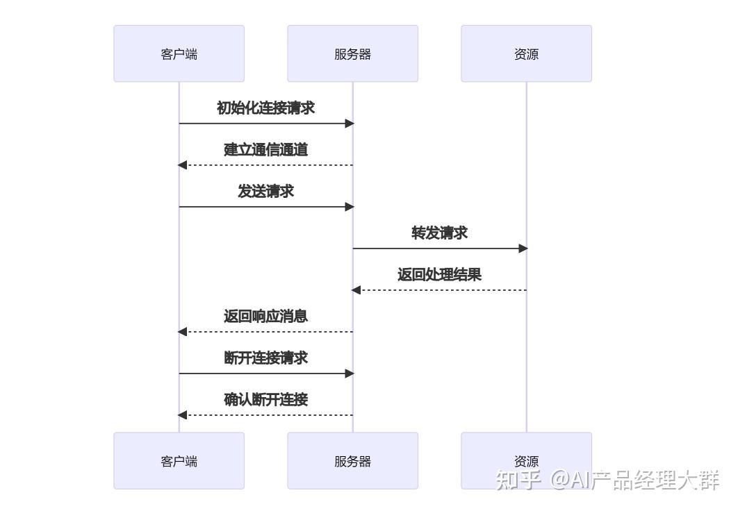 客户端负责发送请求给 MCP 服务器,服务器则将这些请求转发给相应的资源。这种分层的设计使得 MCP 协议能够更好地控制访问权限,确保只有经过授权的用户才能访问特定的资源。