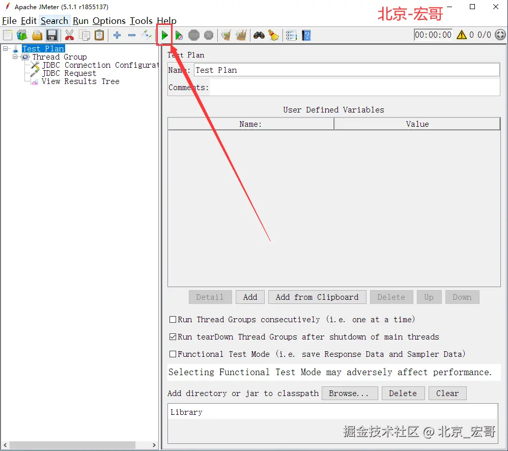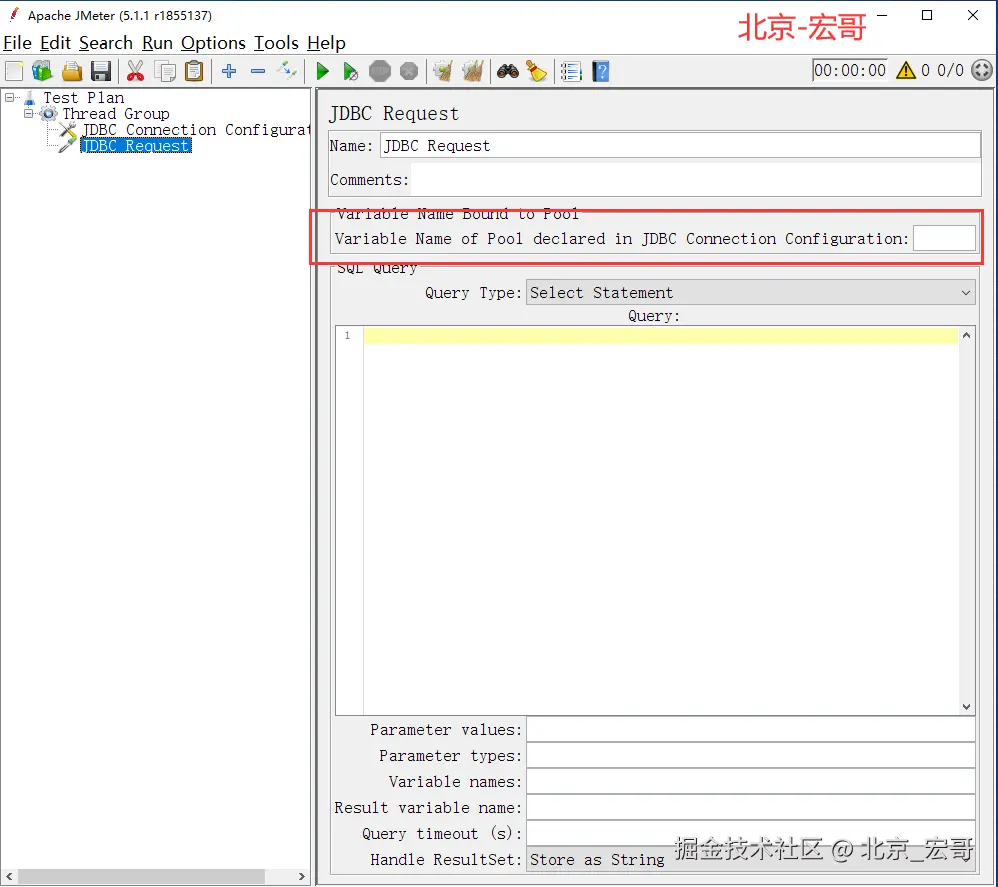 JMeter使用“控制面板”中指定的配置设置创建数据库连接池。在“ 变量名 ”字段的JDBC请求中引用该池。可以使用几种不同的JDBC Configuration元素,但是它们必须具有唯一的名称。每个JDBC请求必须引用一个JDBC配置池。一个以上的JDBC请求可以引用同一个池。