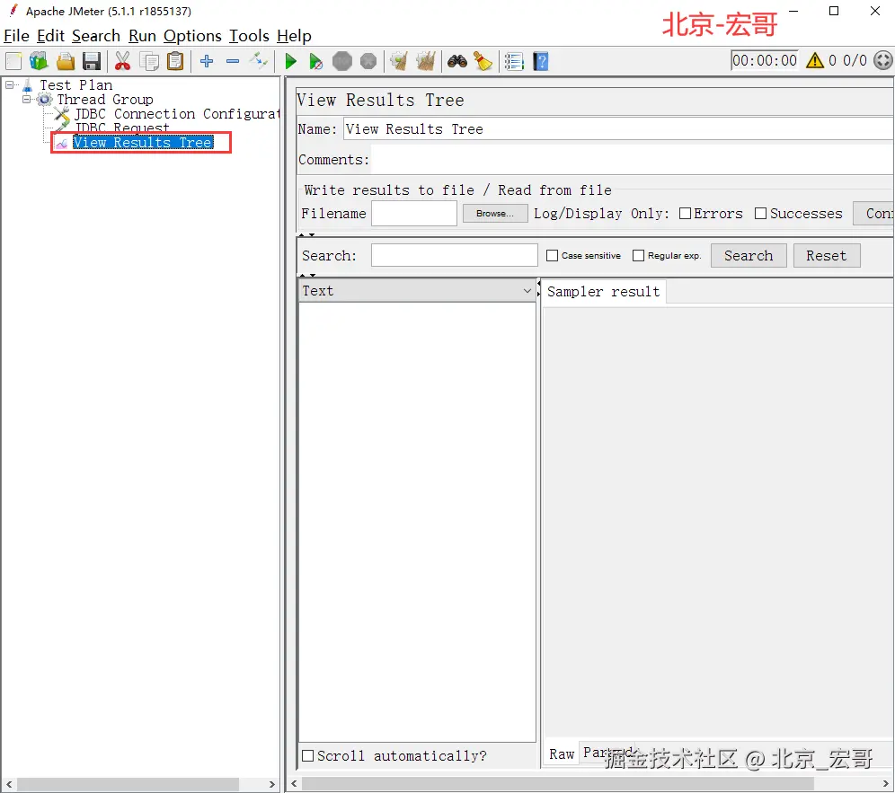 具体步骤: 选择ThreadGroup元件并添加一个结果树的侦听器(添加 → 侦听器 → 结果树)。