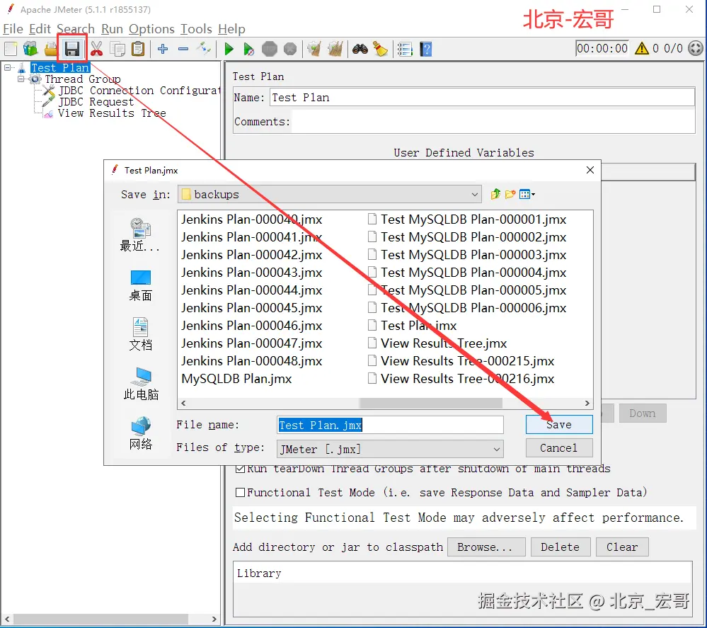 在菜单点击“保存”按钮图标,选择保存位置,点击“Save”保存测试计划,如下图所示: